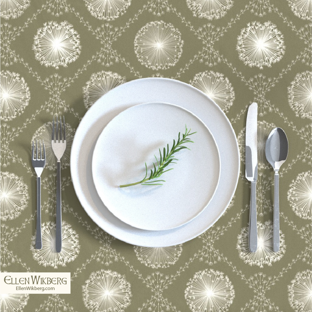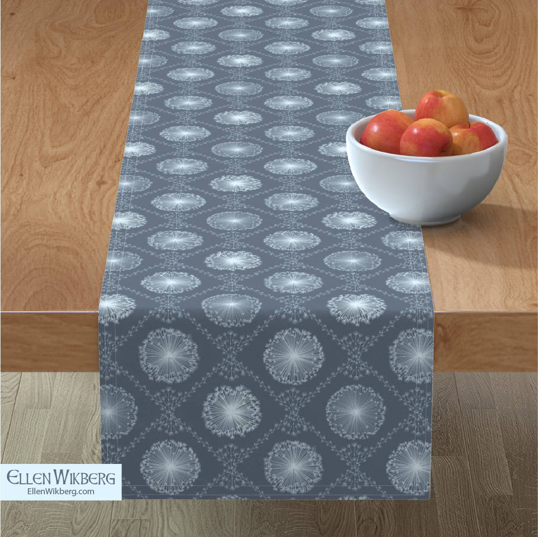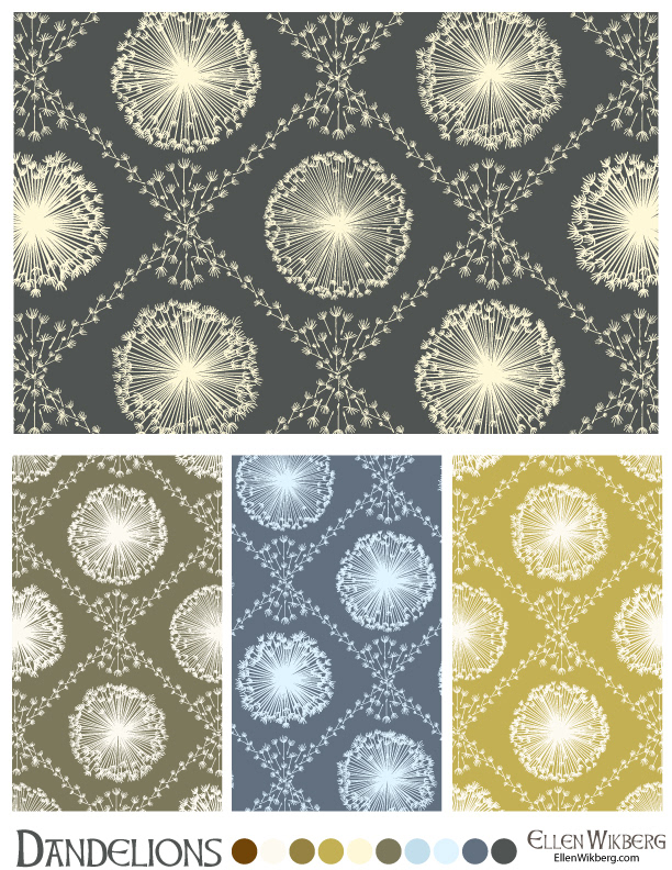 A collection of whimsical dandelions, in a nature inspired geometric floral lattice pattern, with solids in a variety of colorways.