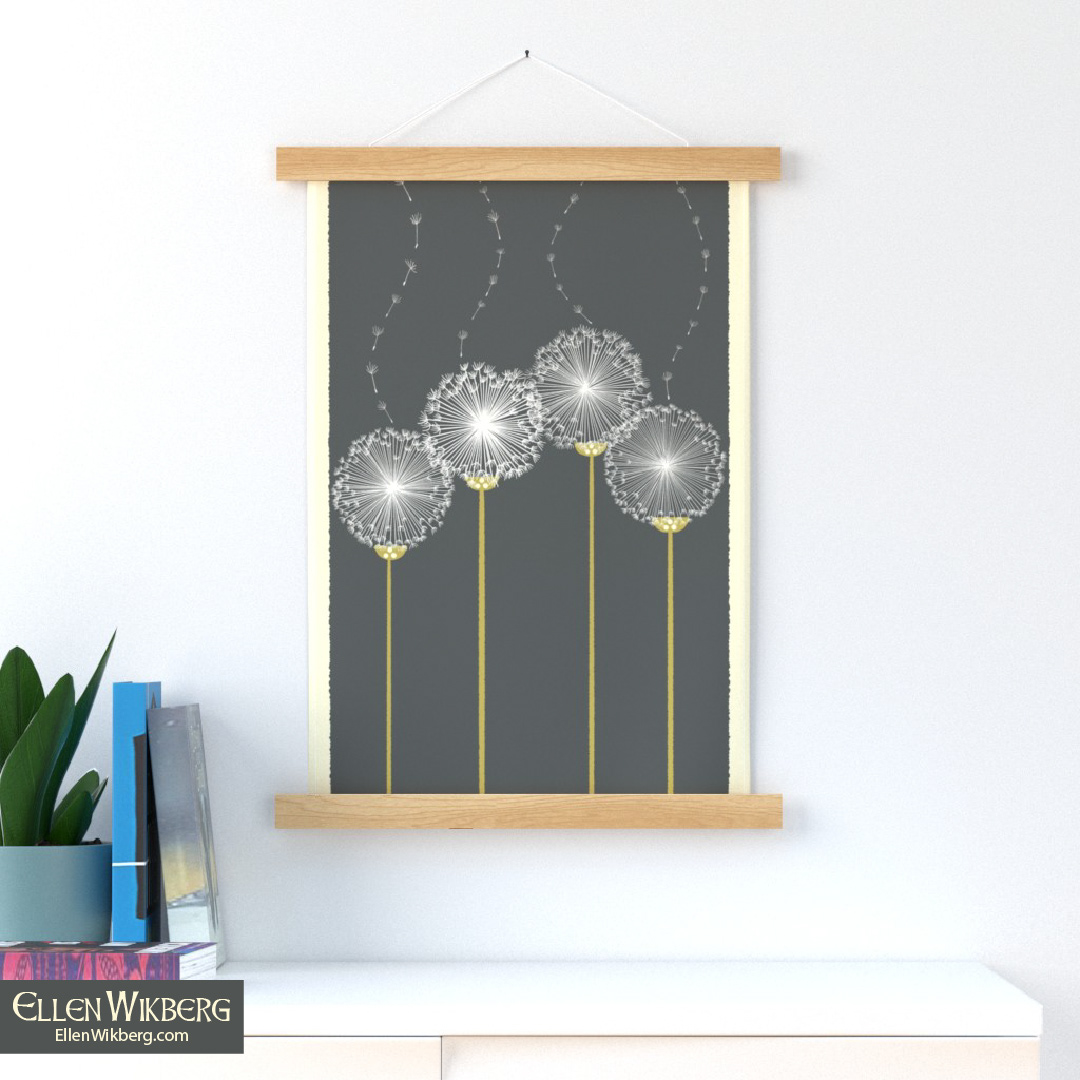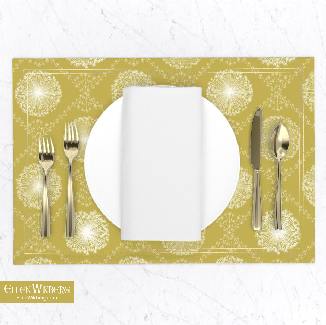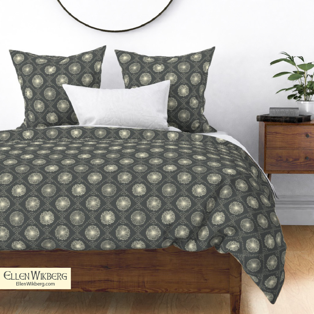 A collection of whimsical dandelions, in a nature inspired geometric floral lattice pattern, with solids in a variety of colorways.